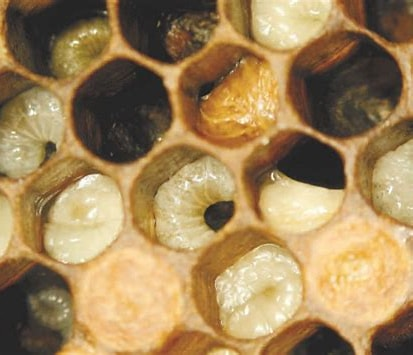 Les larves malades ou mortes sont généralement détectées par les ouvrières et expulsées, mais lorsque ce n’est pas fait à temps, elles se dessèchent et forment une croûte au fond de l’alvéole.